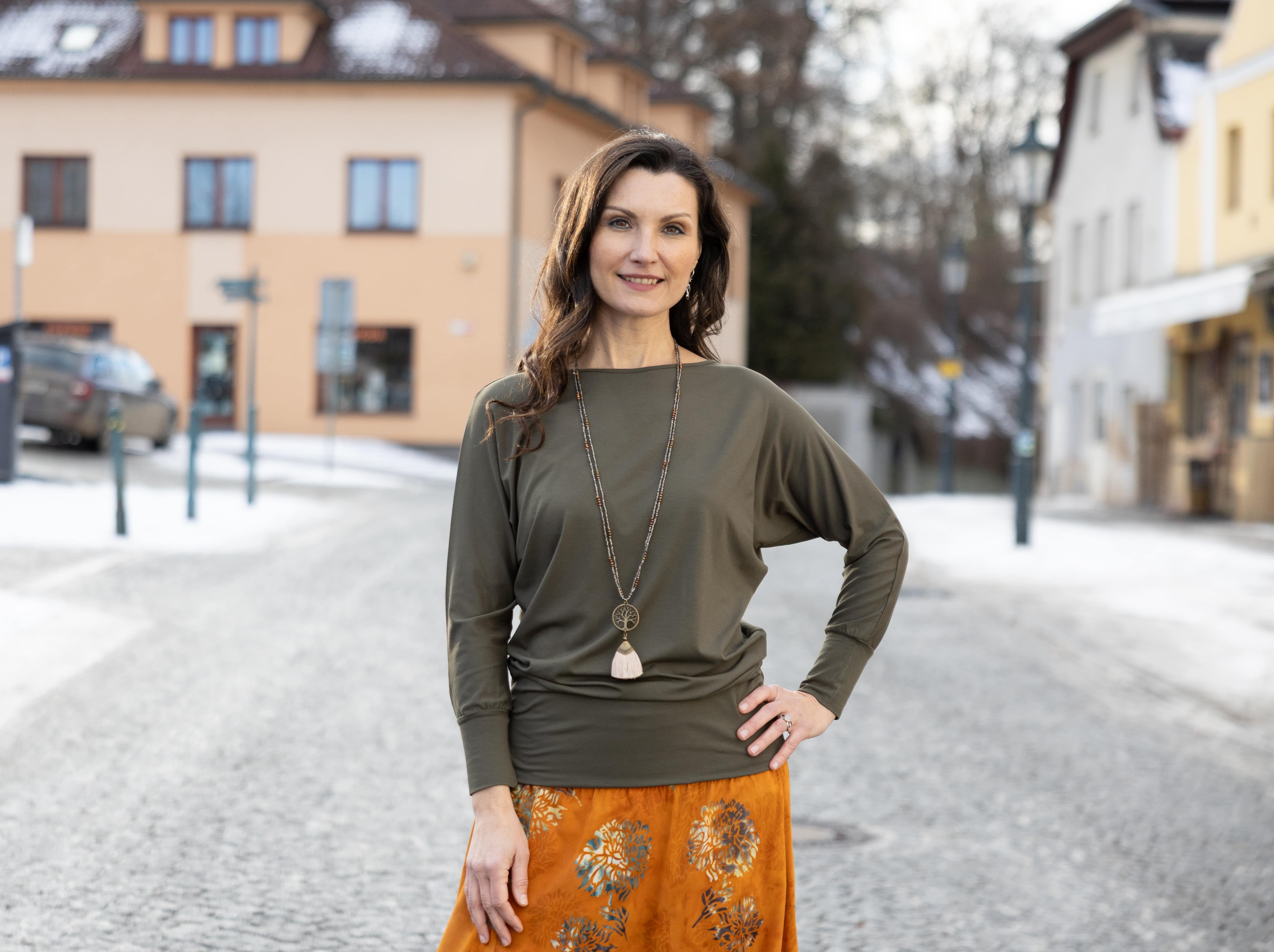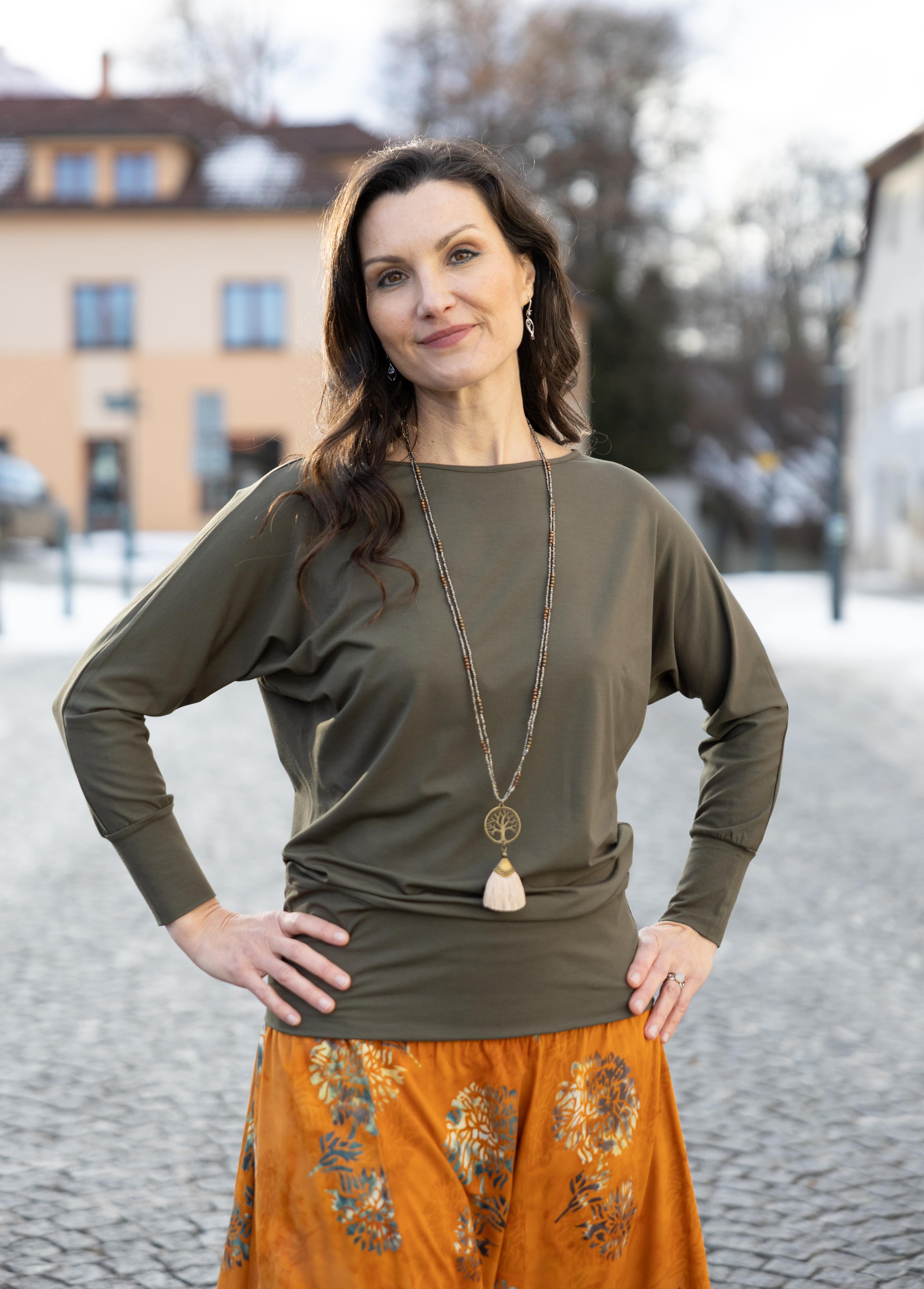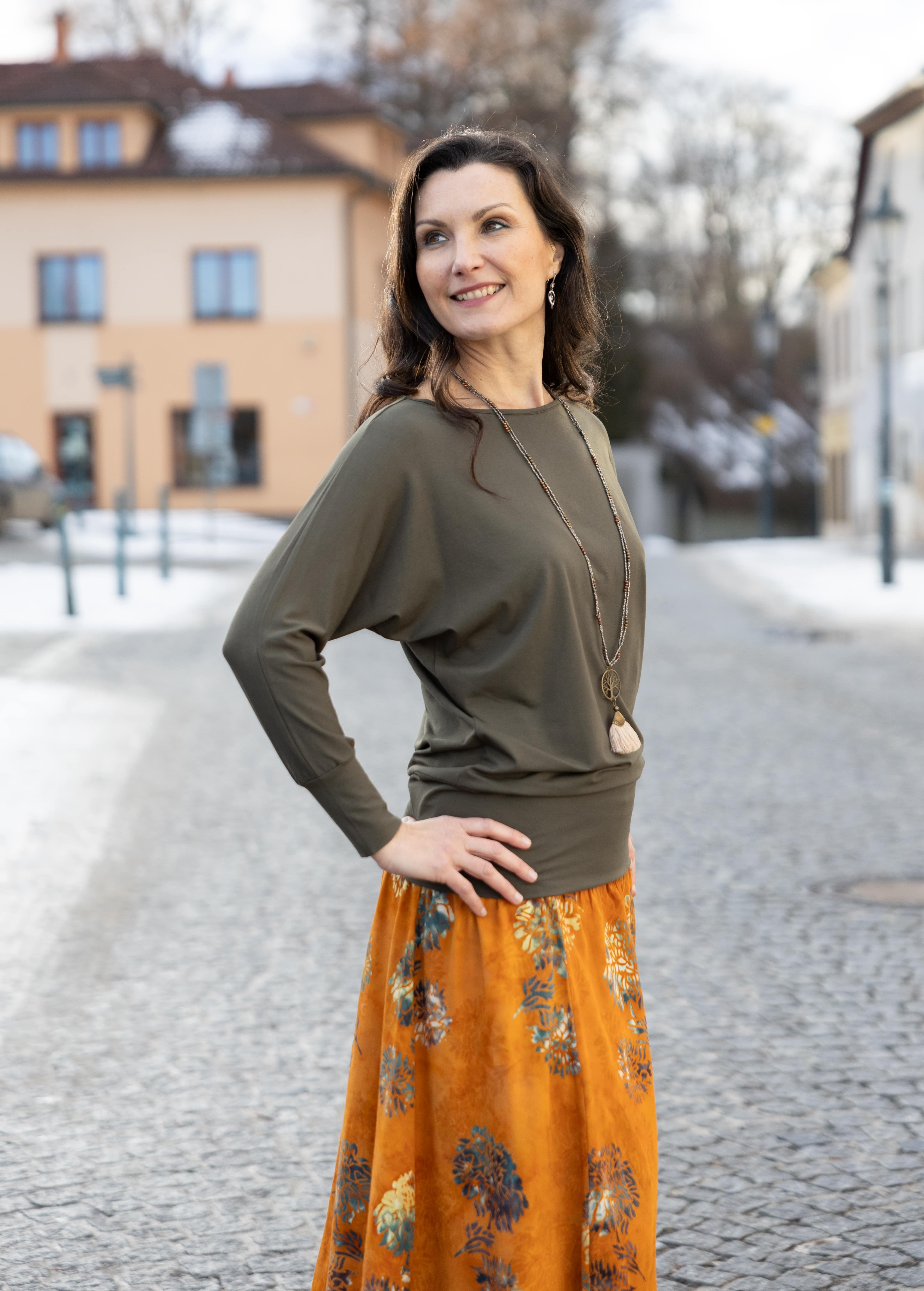 • Dlouhý netopýří rukáv a decentní lodičkový výstřih