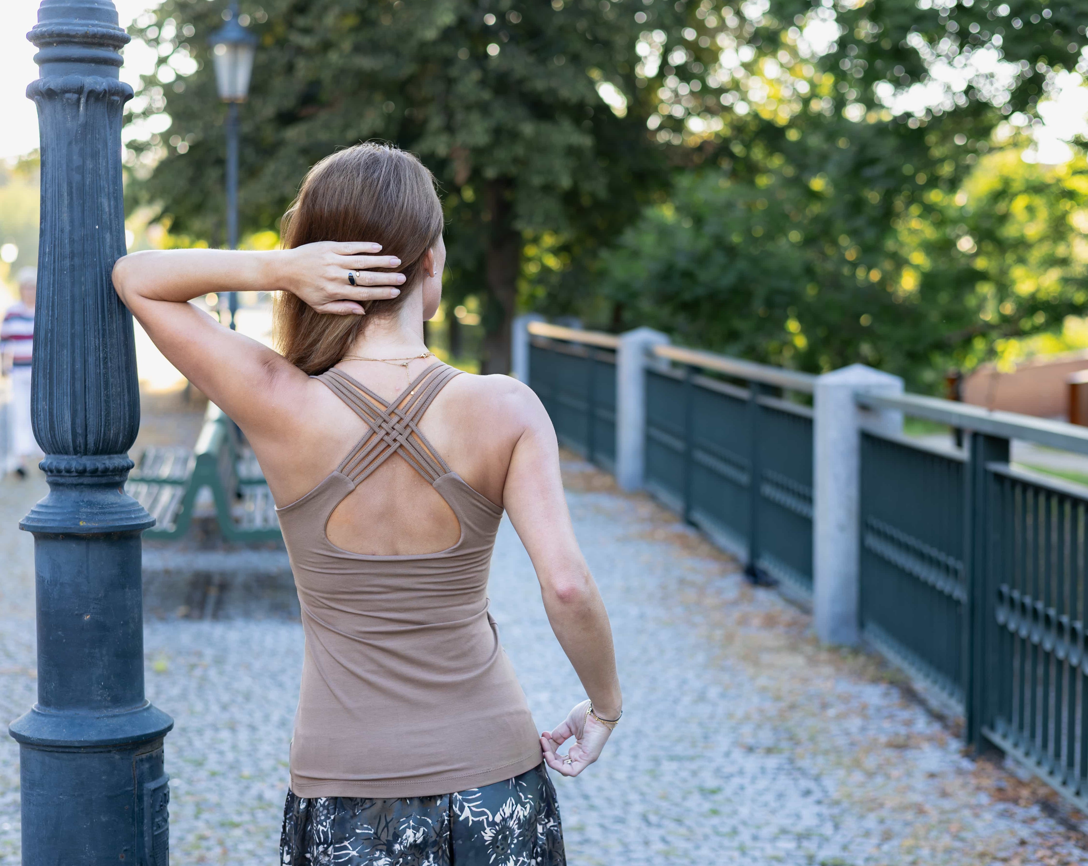 Pružné tílko s širokými ramínky, všitou braletkou a překřížením na zádech.