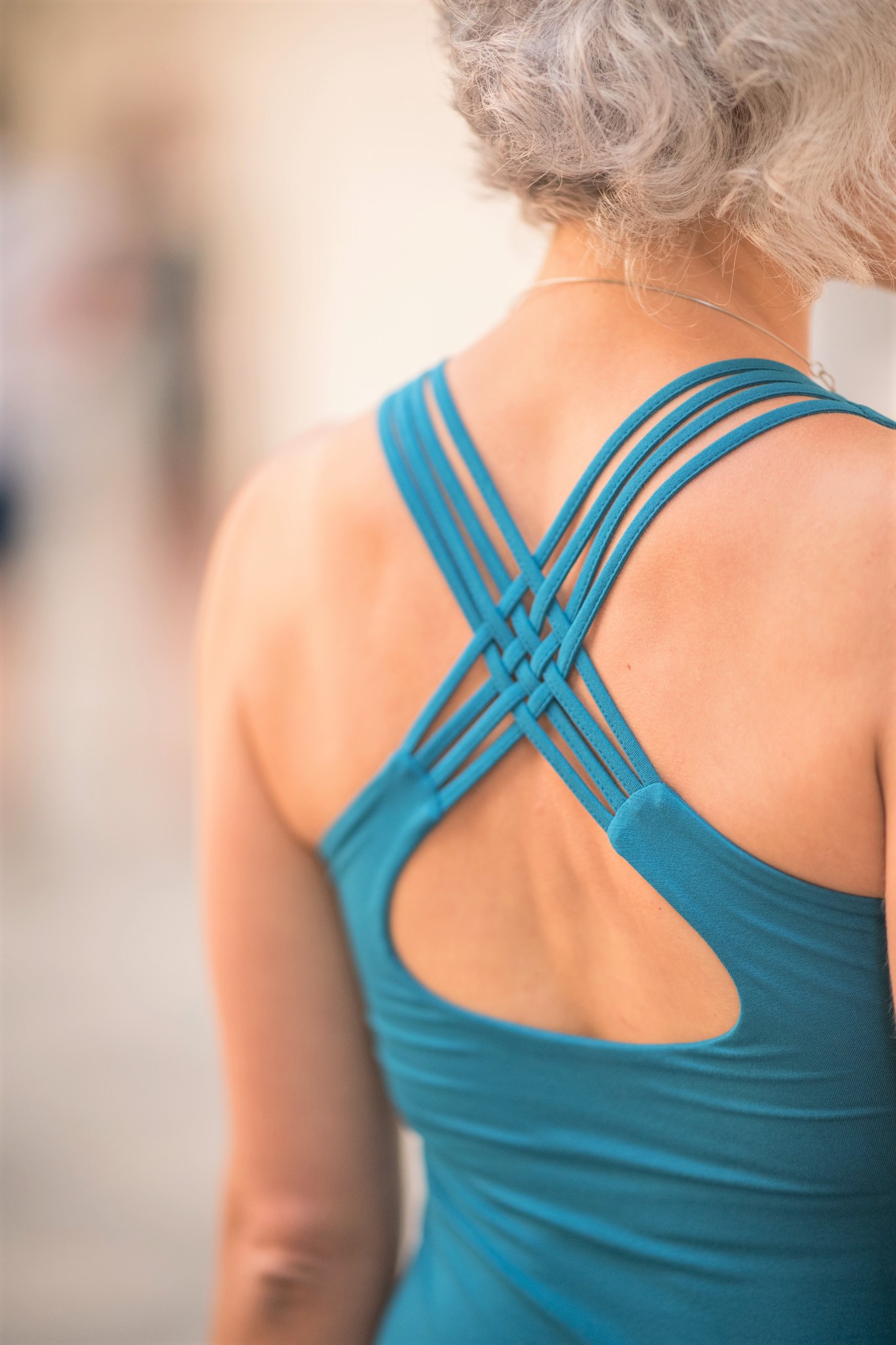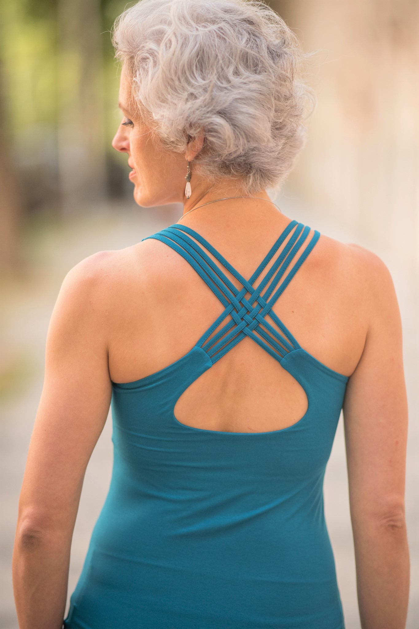 Pružné tílko s širokými ramínky, všitou braletkou a překřížením na zádech.