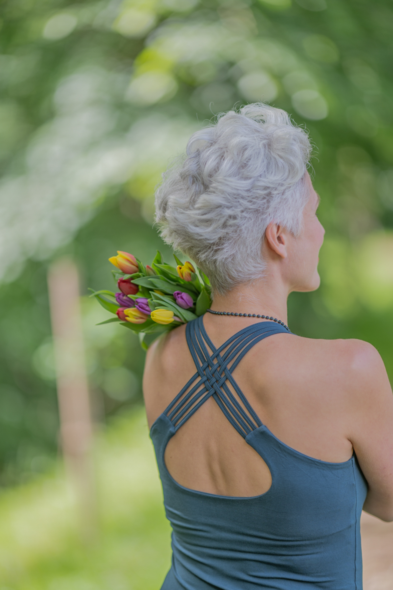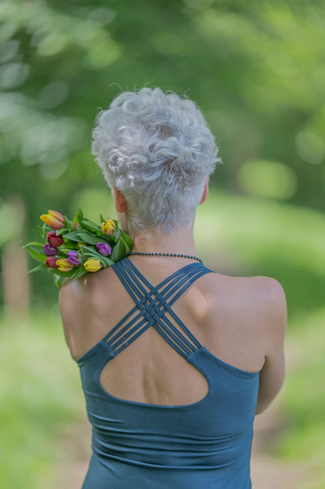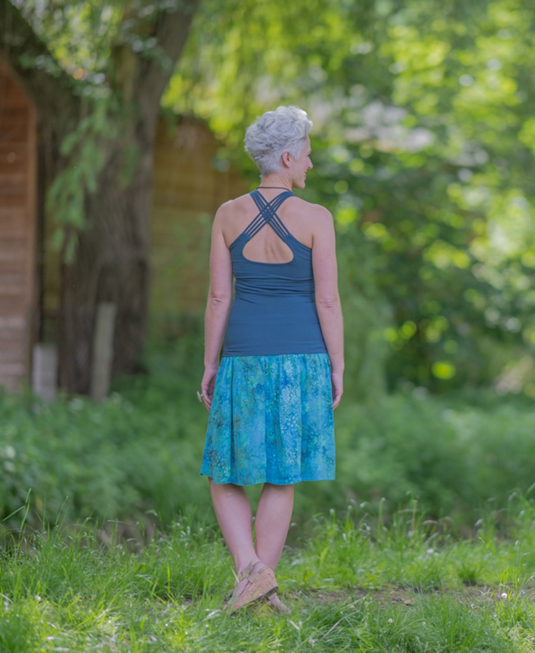 Pružné tílko s širokými ramínky, všitou braletkou a překřížením na zádech.