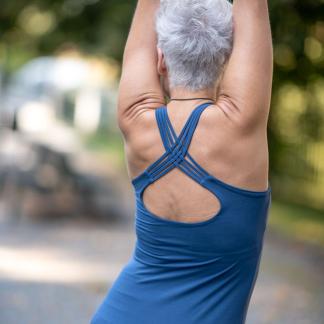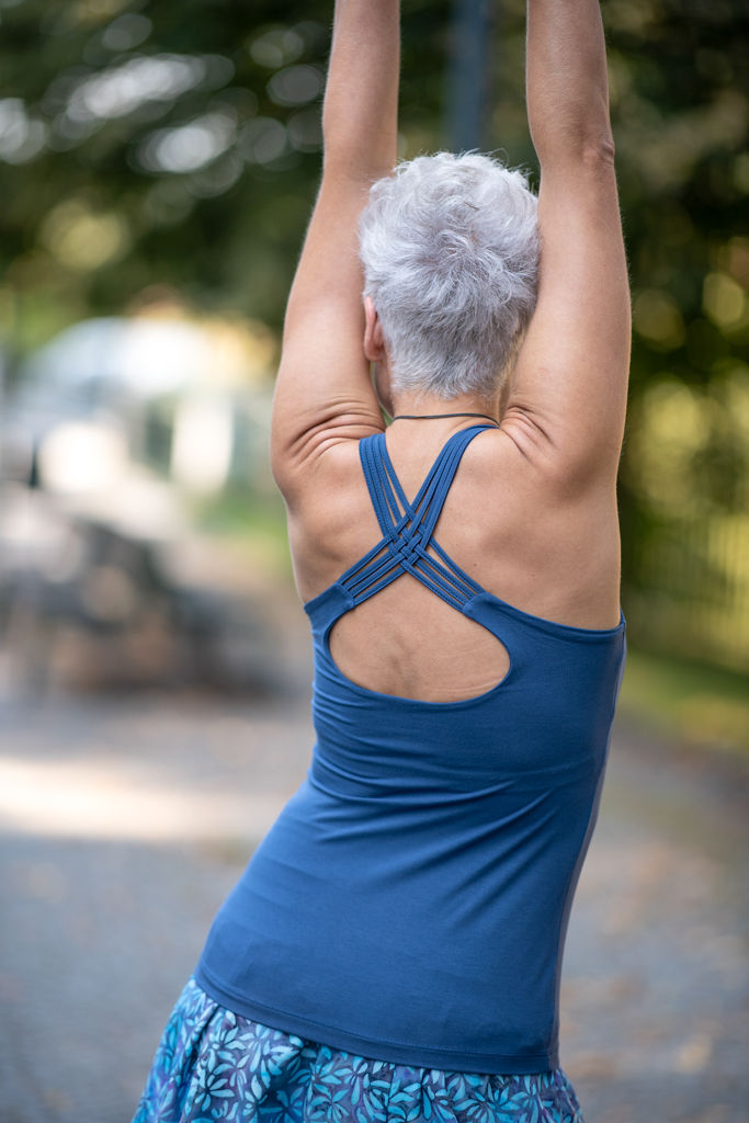 Pružné tílko s širokými ramínky, všitou braletkou a překřížením na zádech.