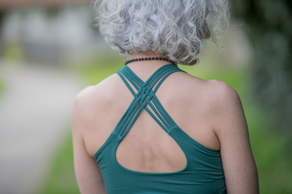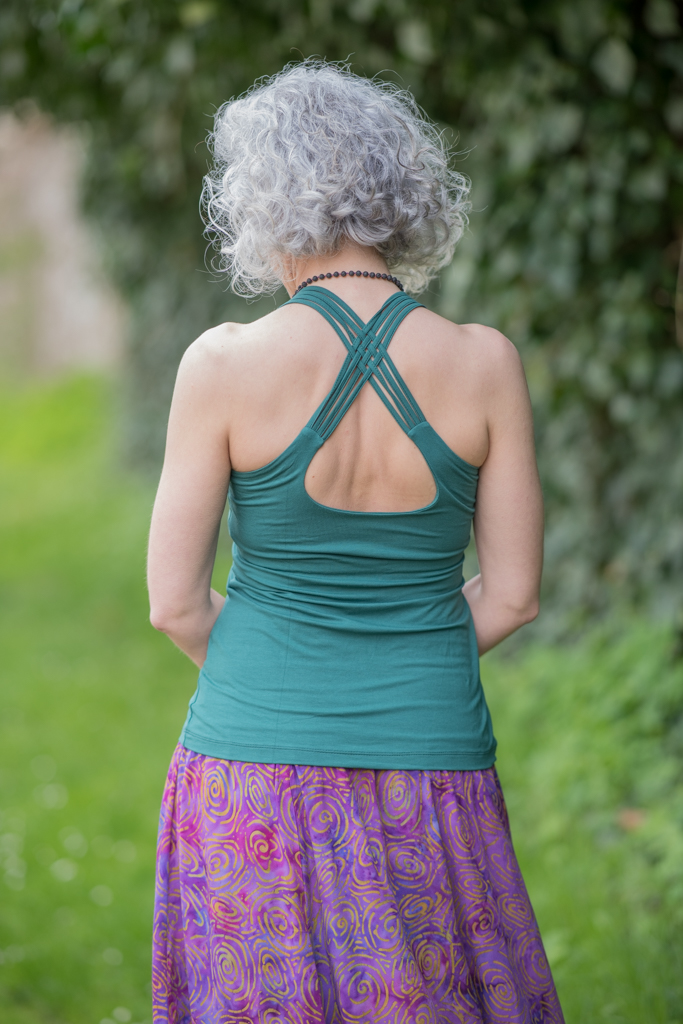 Pružné tílko s širokými ramínky, všitou braletkou a překřížením na zádech.