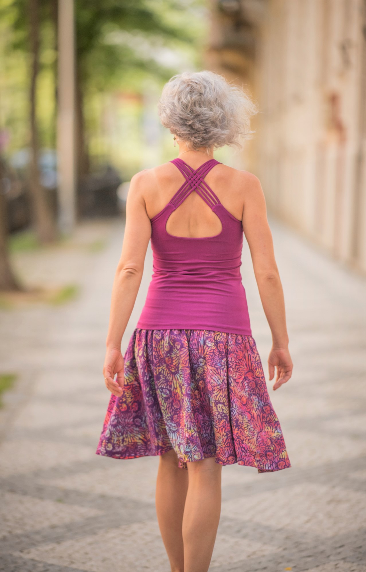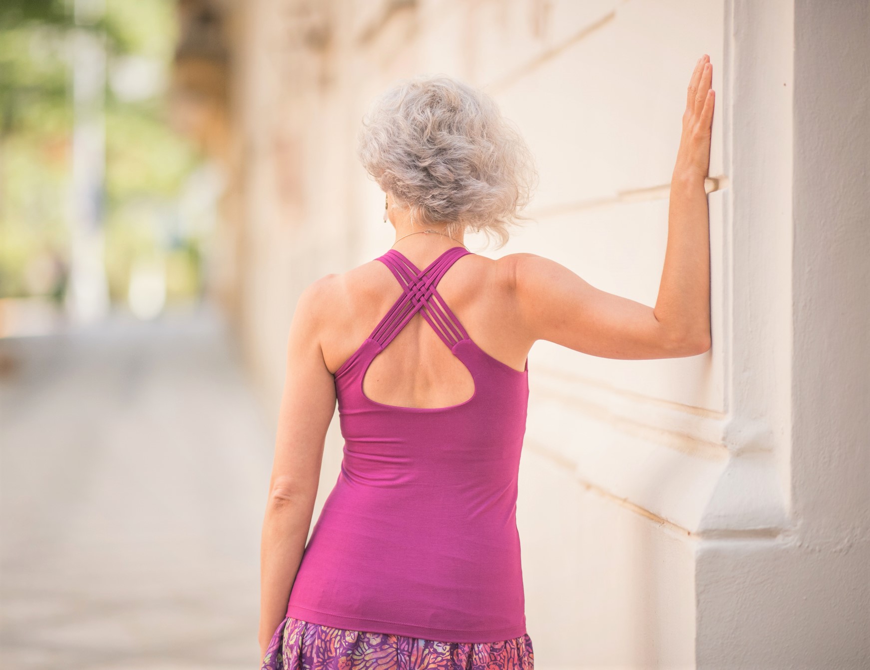 Pružné tílko s širokými ramínky, všitou braletkou a překřížením na zádech.