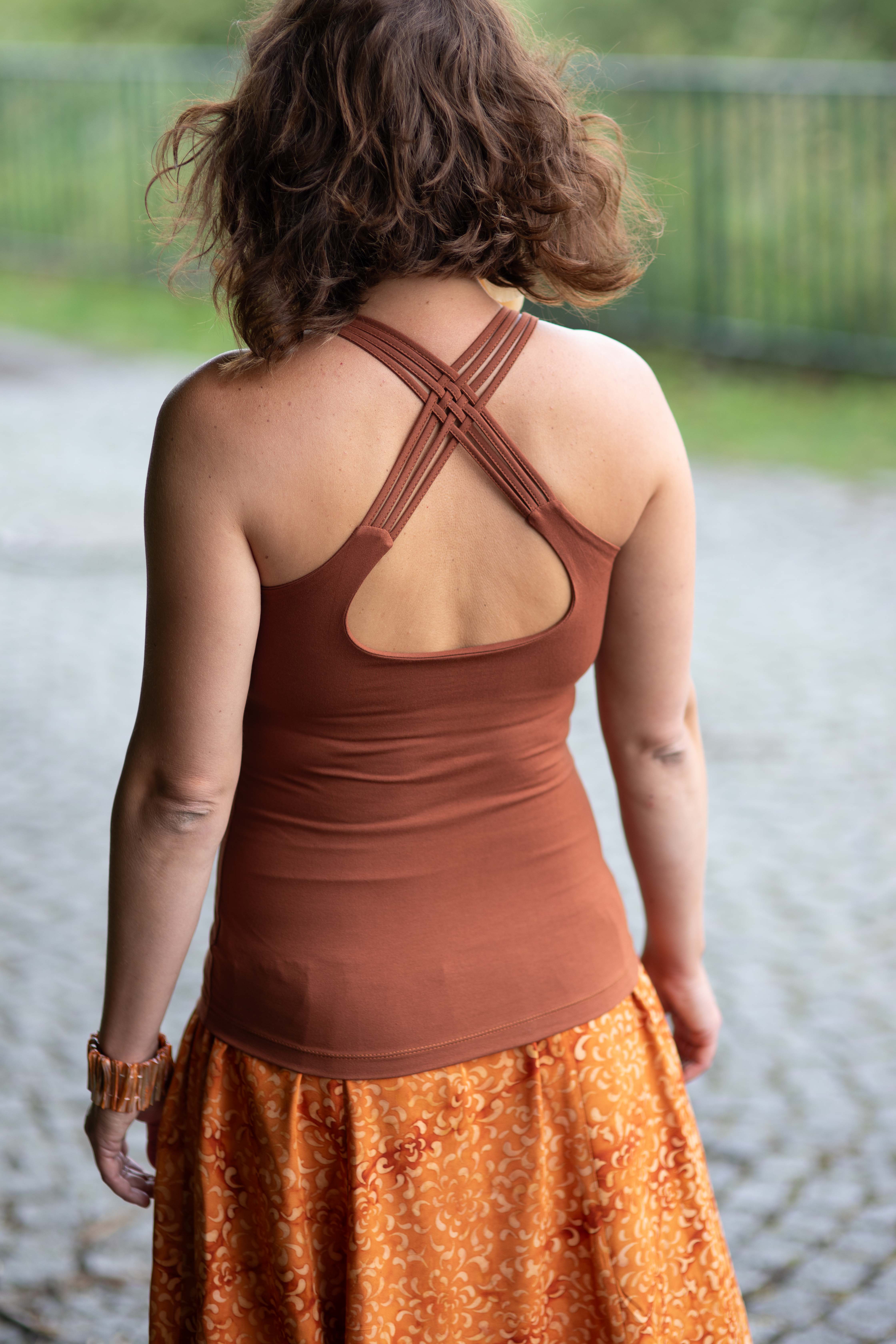Pružné tílko s širokými ramínky, všitou braletkou a překřížením na zádech.