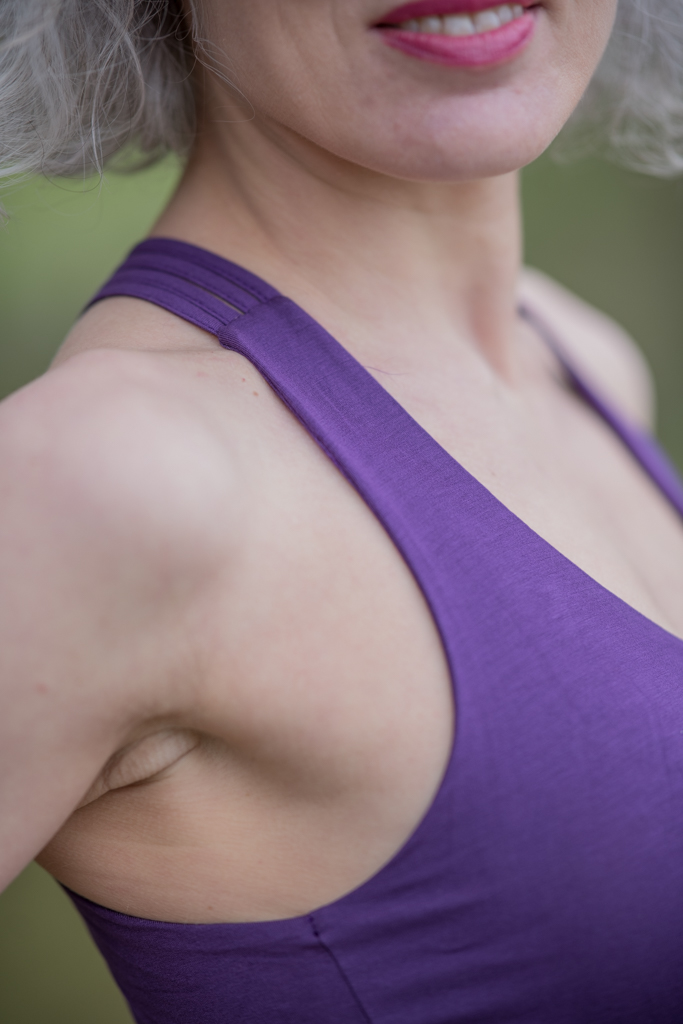 Pružné tílko s širokými ramínky, všitou braletkou a překřížením na zádech.