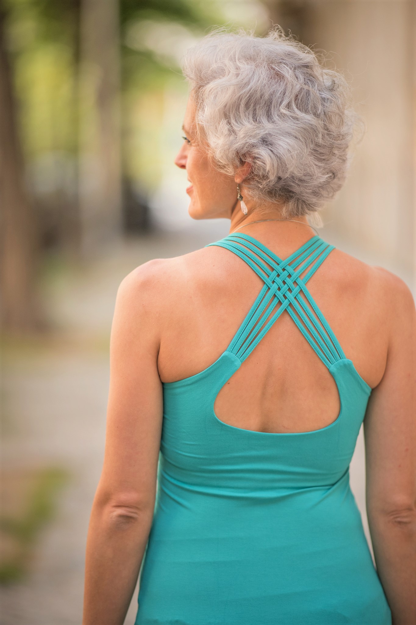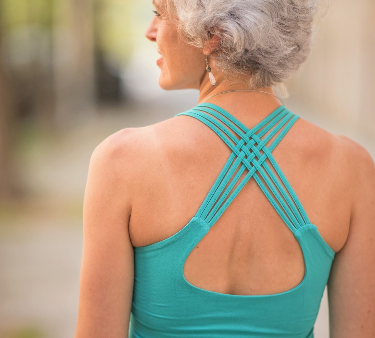 Pružné tílko s širokými ramínky, všitou braletkou a překřížením na zádech.