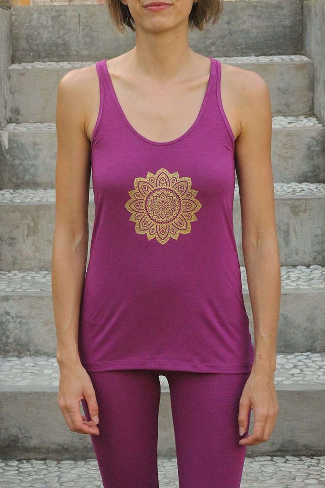 Tílko Bea s potiskem mandaly zlaté barvy je vyrobeno ze stejně příjemného materiálu jako naše braletky, legíny, trika, tílka a lemy u oblíbených dlouhých a krátkých sukní.