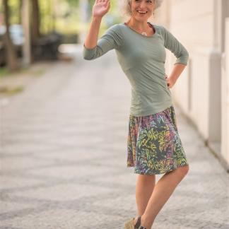 Triko Keira je vyrobené z příjemné viskózy, stejně jako naše braletky, legínytrika s krátkým rukávem a lemy u pohodlných dlouhých i krátkých sukní.
