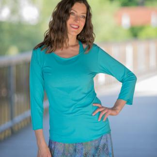 Vyzkoušejte si také, jak vám bude tričko slušet výstřihem dozadu. Na zádech zvýrazní linii šíje a vepředu vytvoří elegantní lodičkový výstřih.
