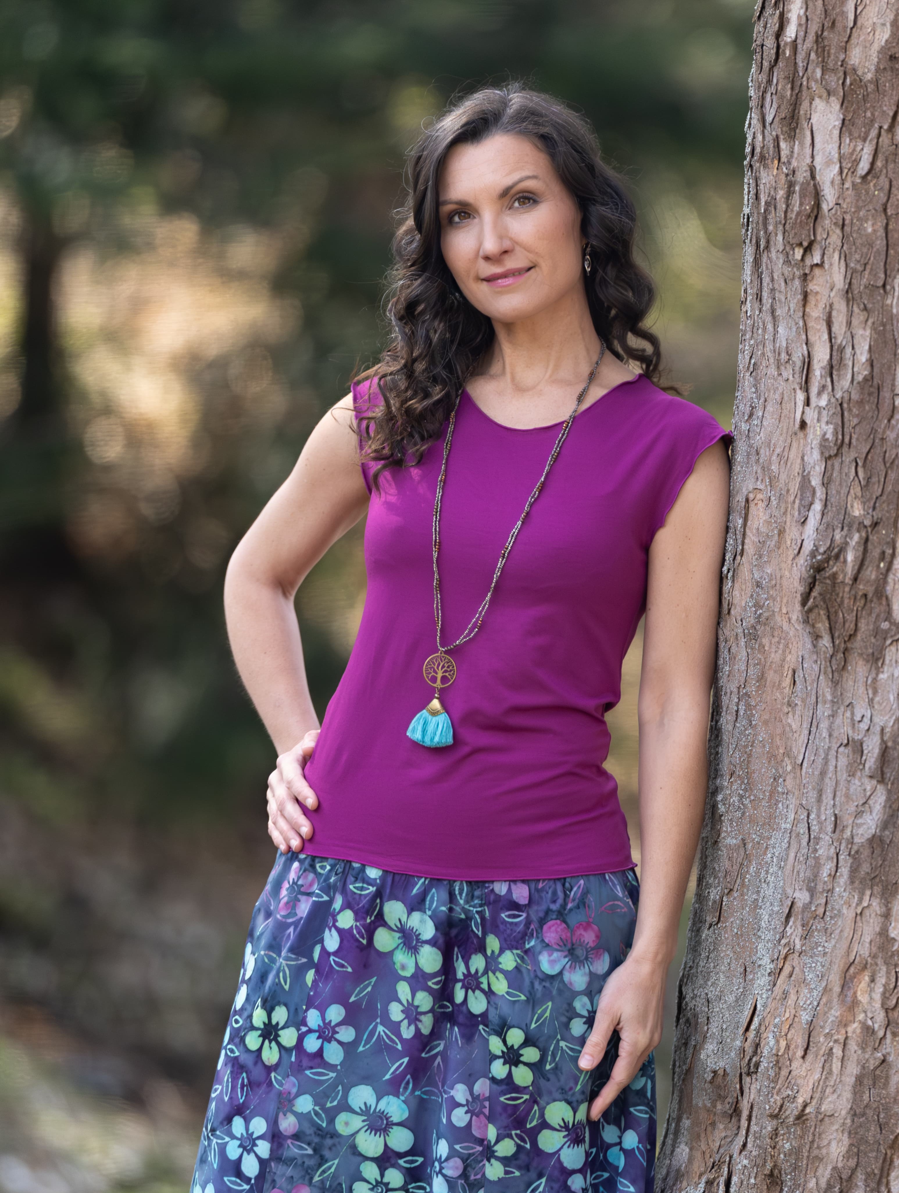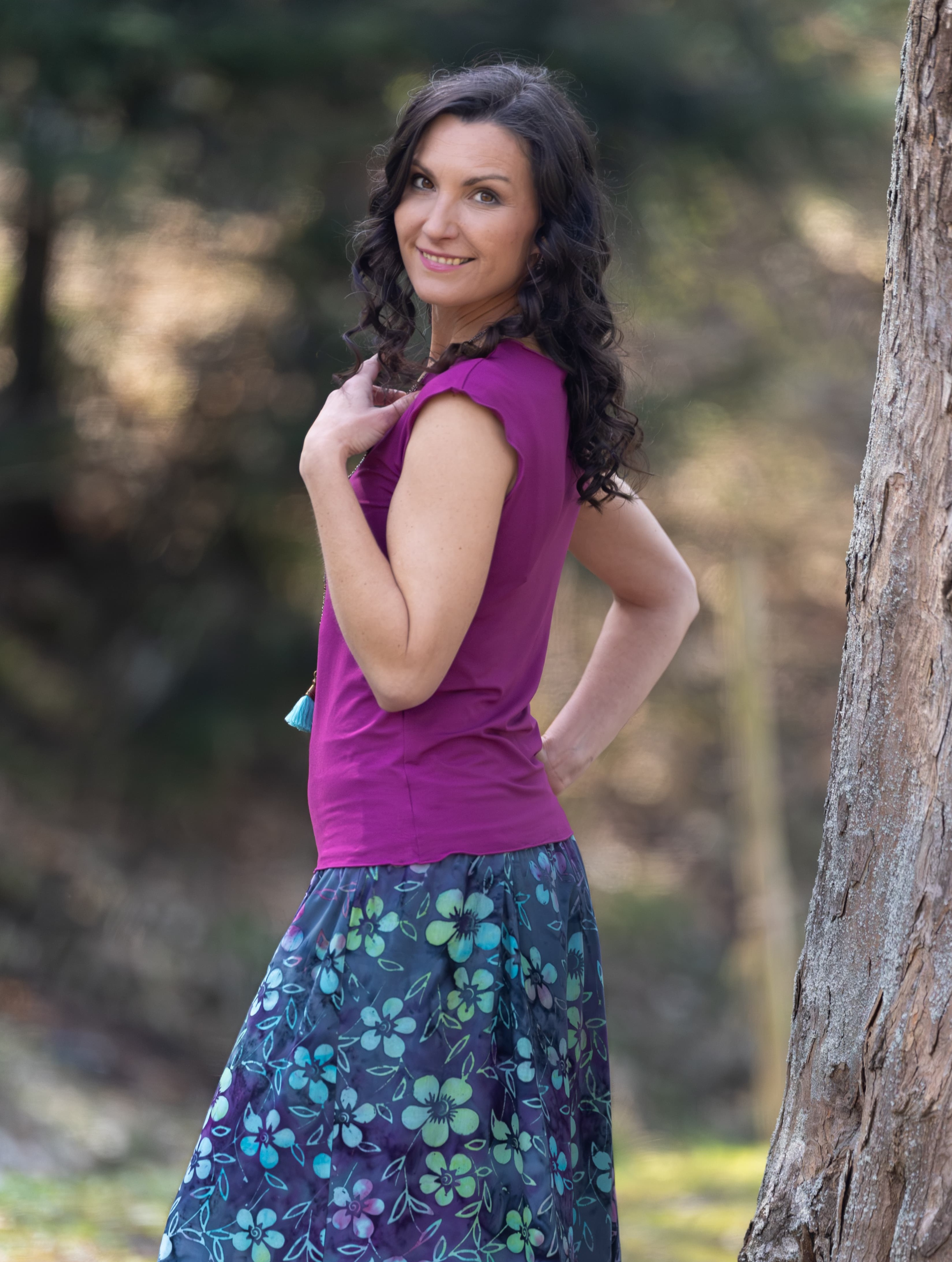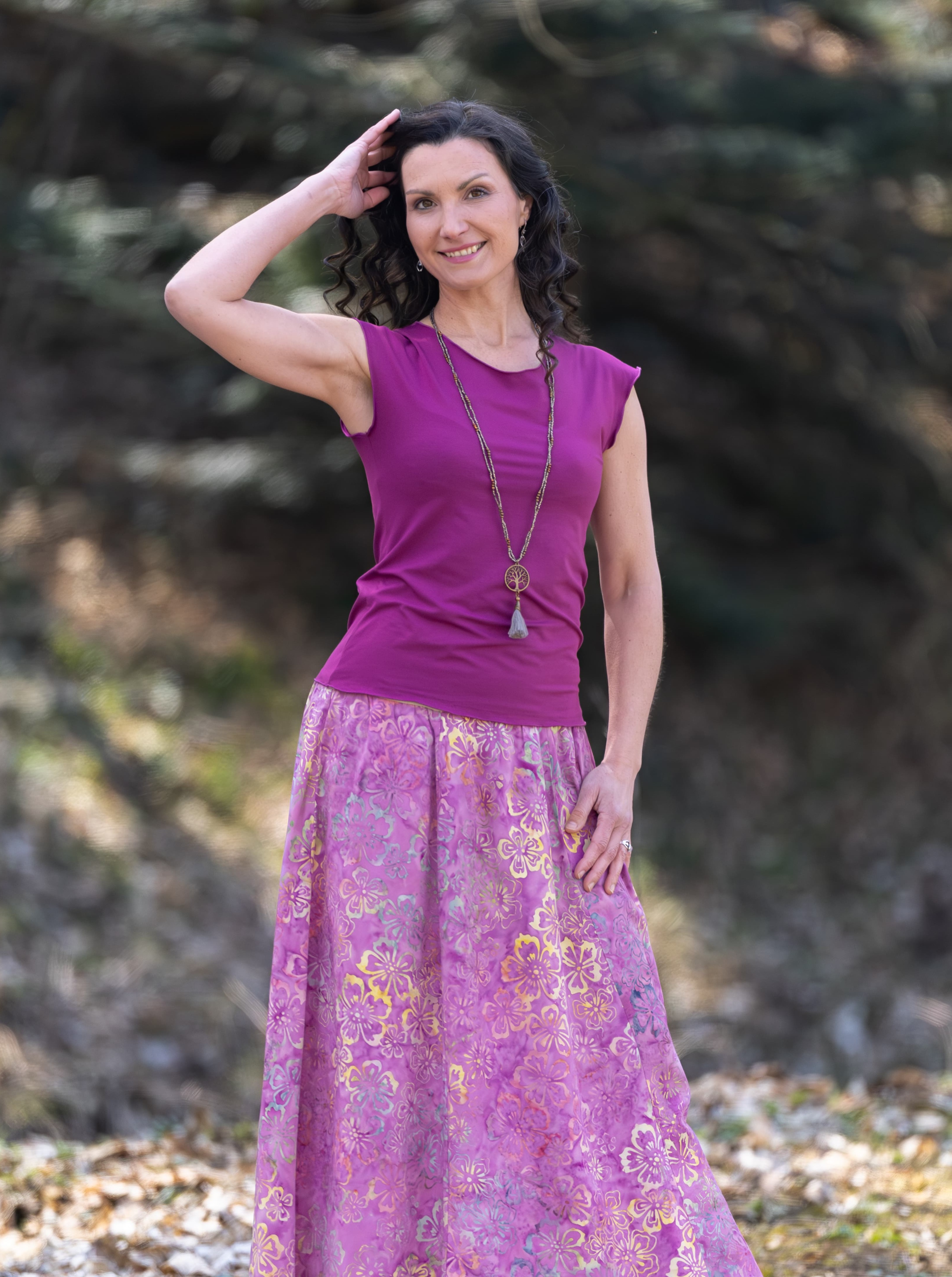 Triko Sunny je vyrobené z příjemné viskózy, stejně jako naše braletky, legíny, trika s ¾ rukávem a lemy u pohodlným dlouhých i krátkých sukní.