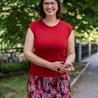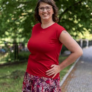 Zepředu vidíte jednoduché minimalistické tričko s klasickým kulatým výstřihem a jednoduchým spadeným rukávem. Ale když se otočíte, odhalíte zajímavě řešený zadní díl.