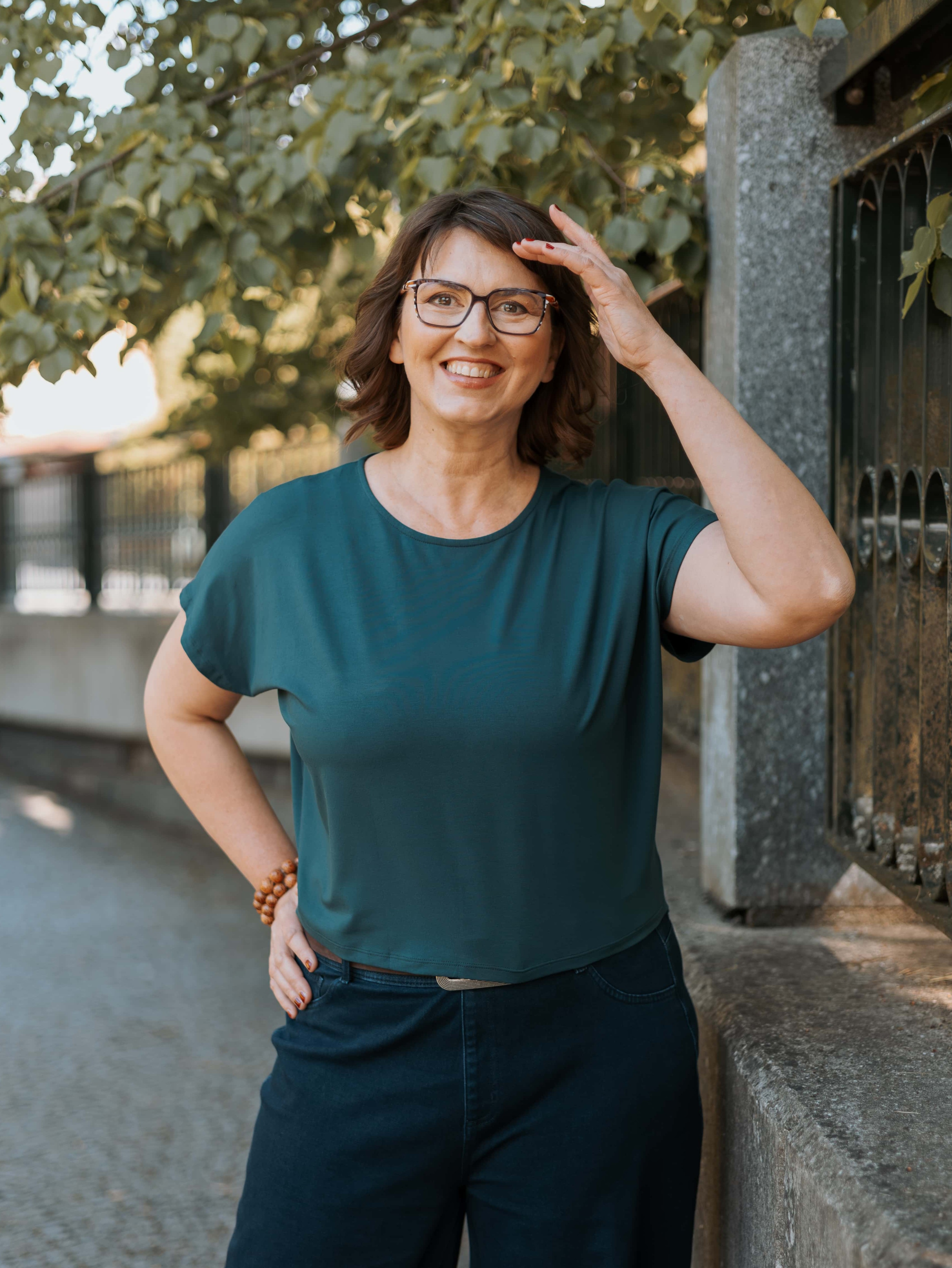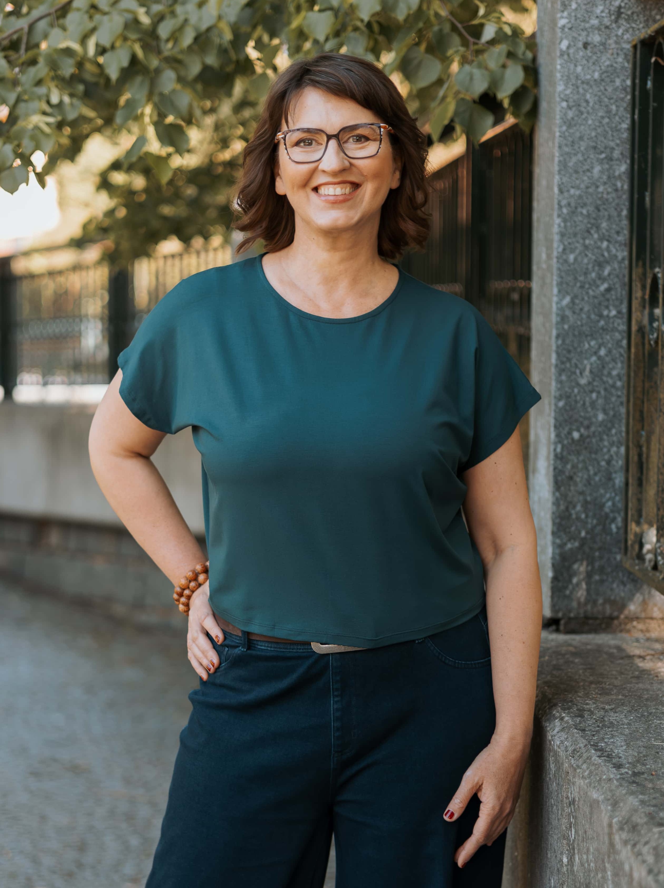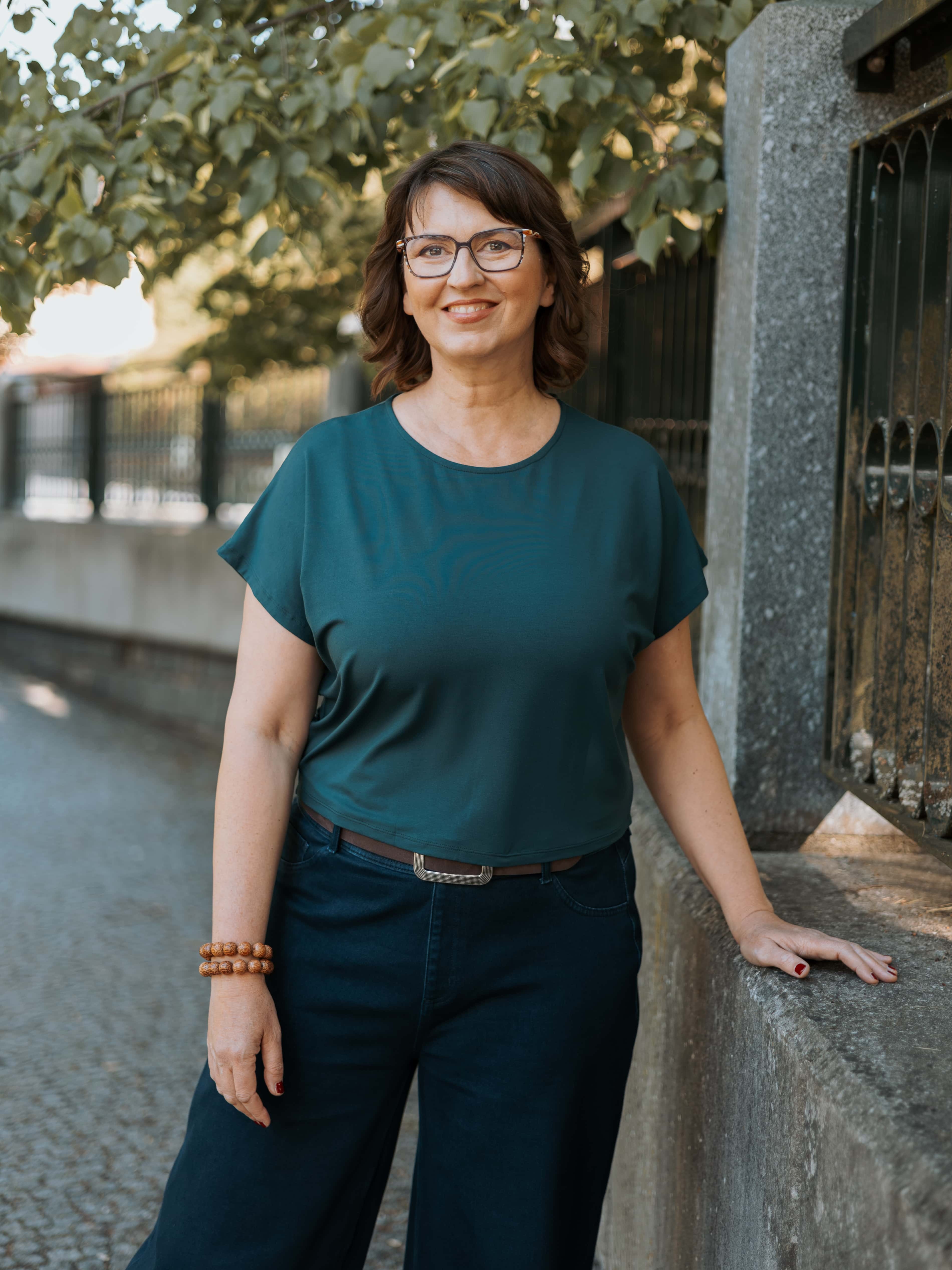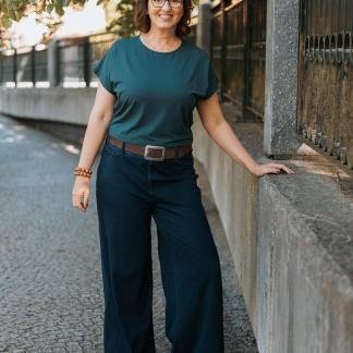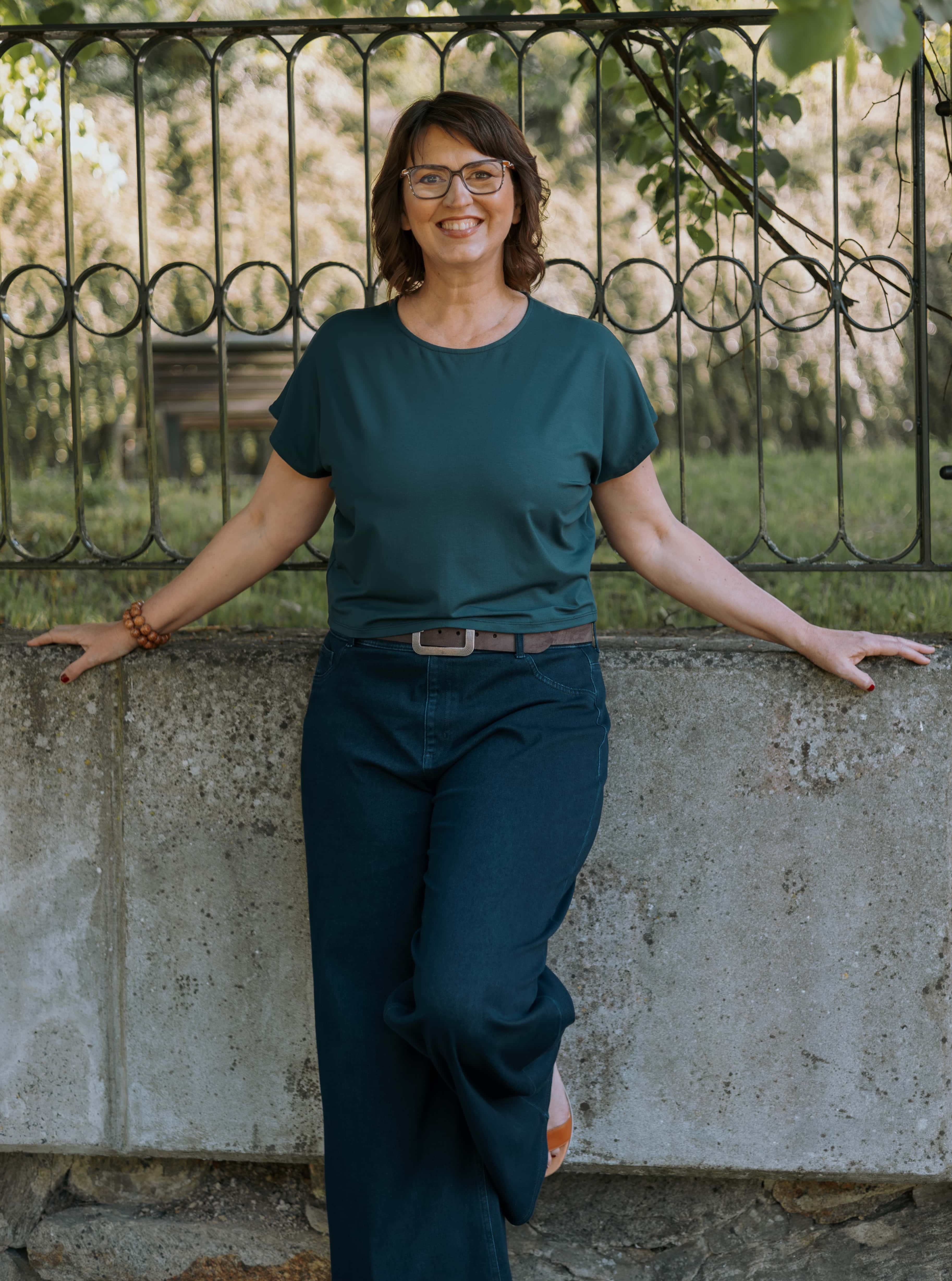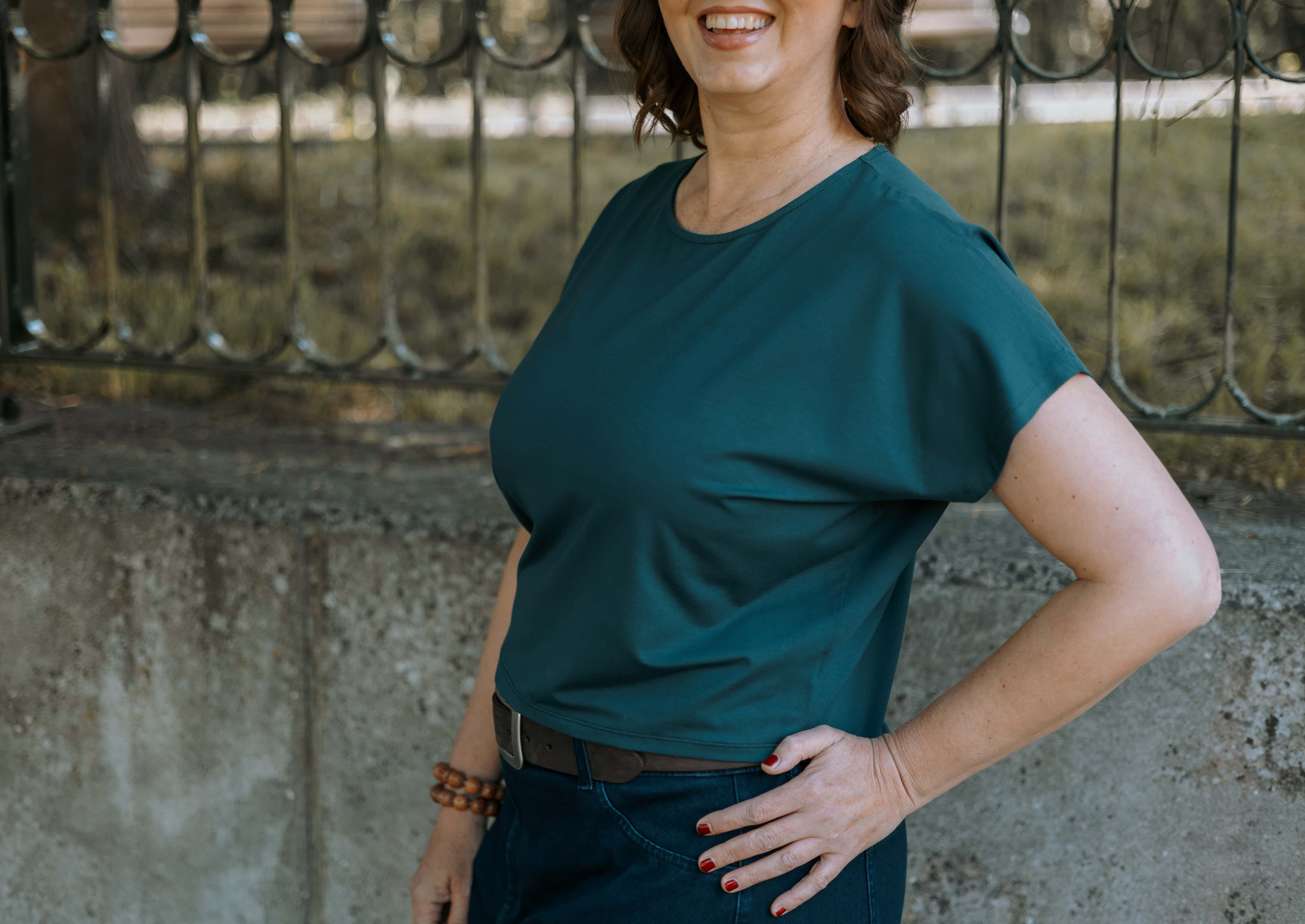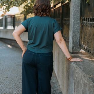 Kratší střih typu crop top s kulatým výstřihem a vzdušnými netopýřími rukávy se perfektně hodí na jaro, léto i teplý podzim.