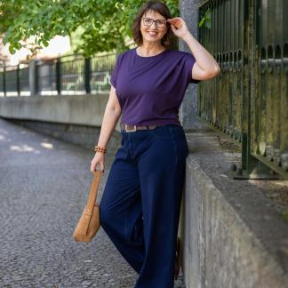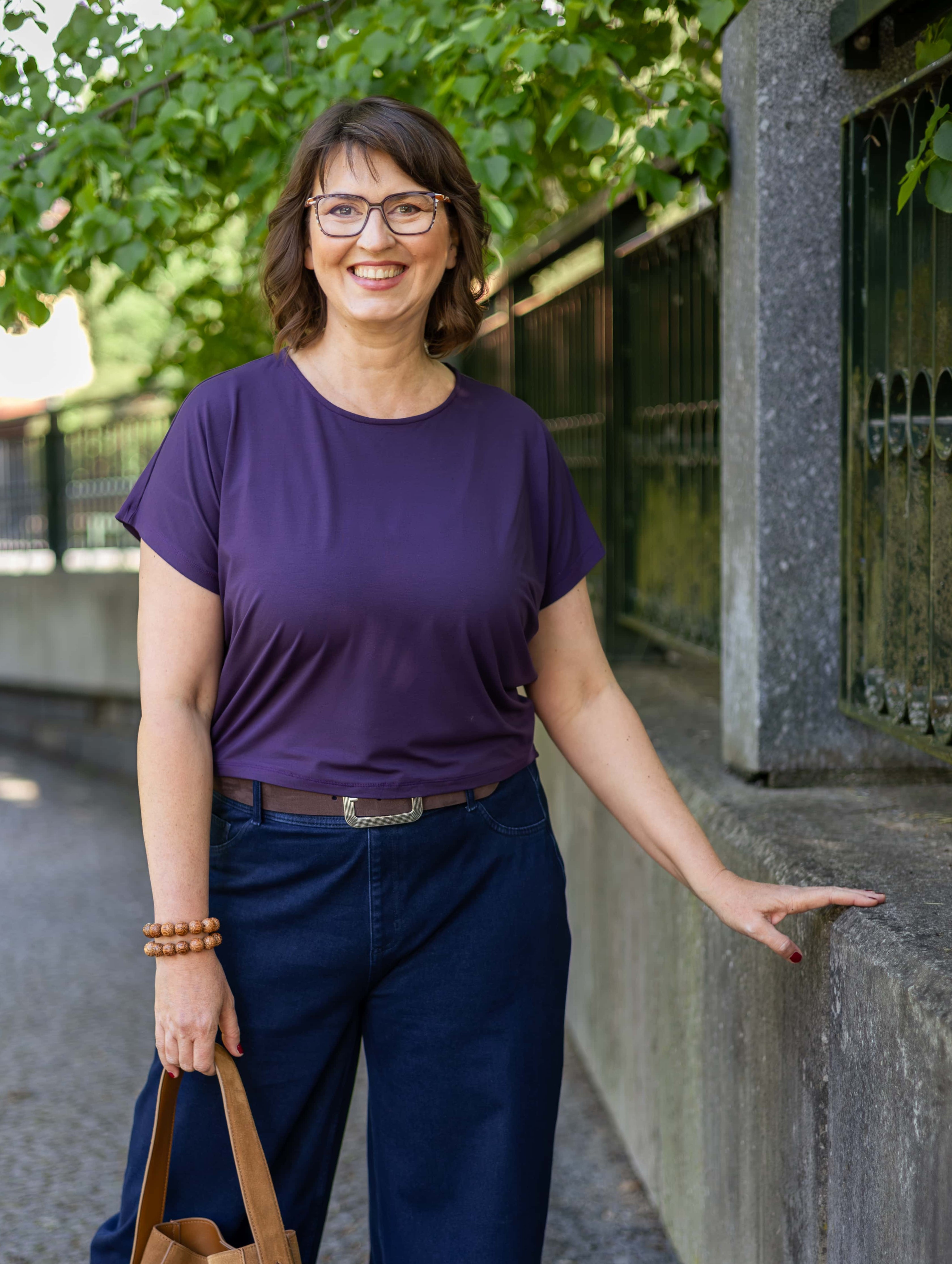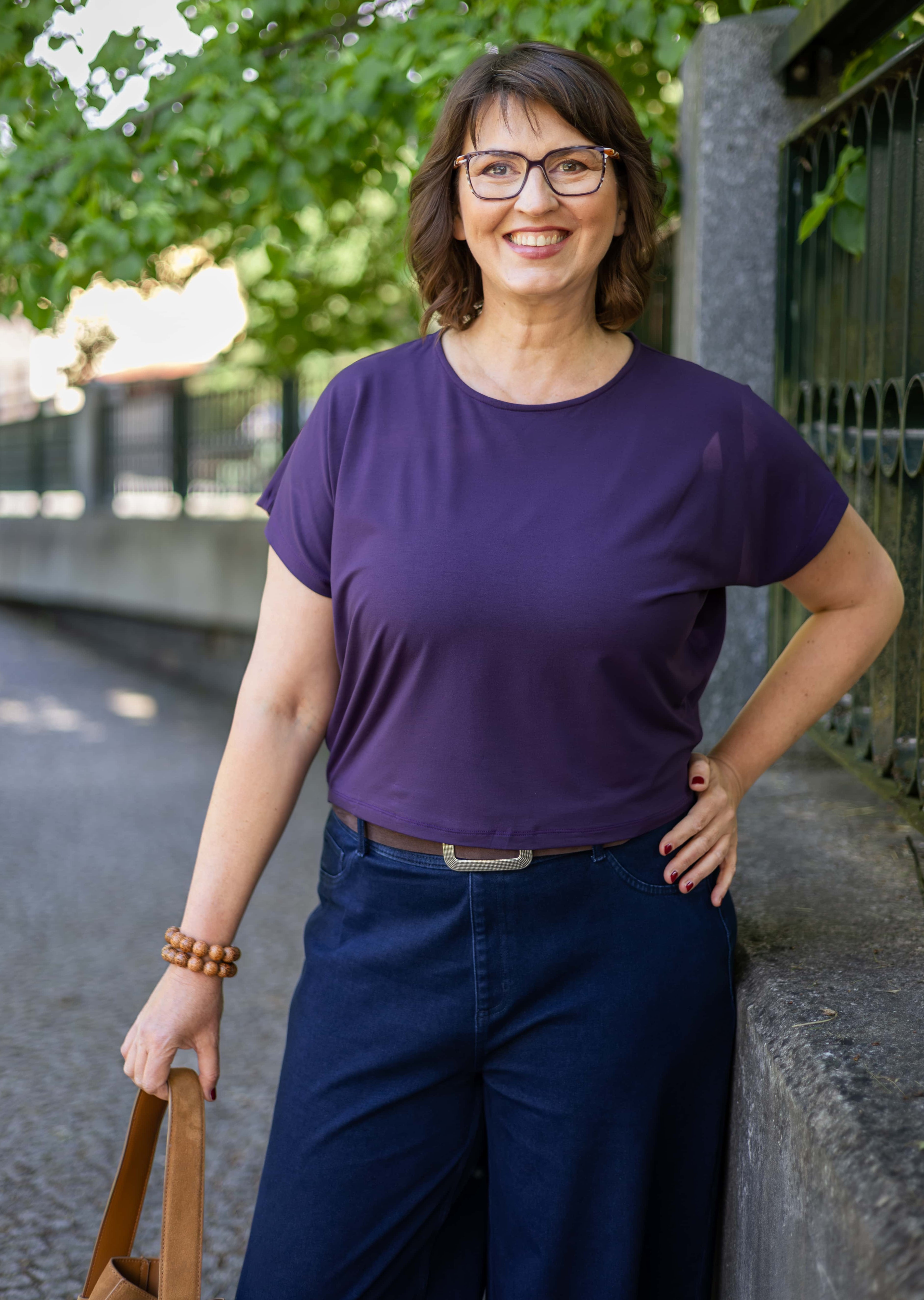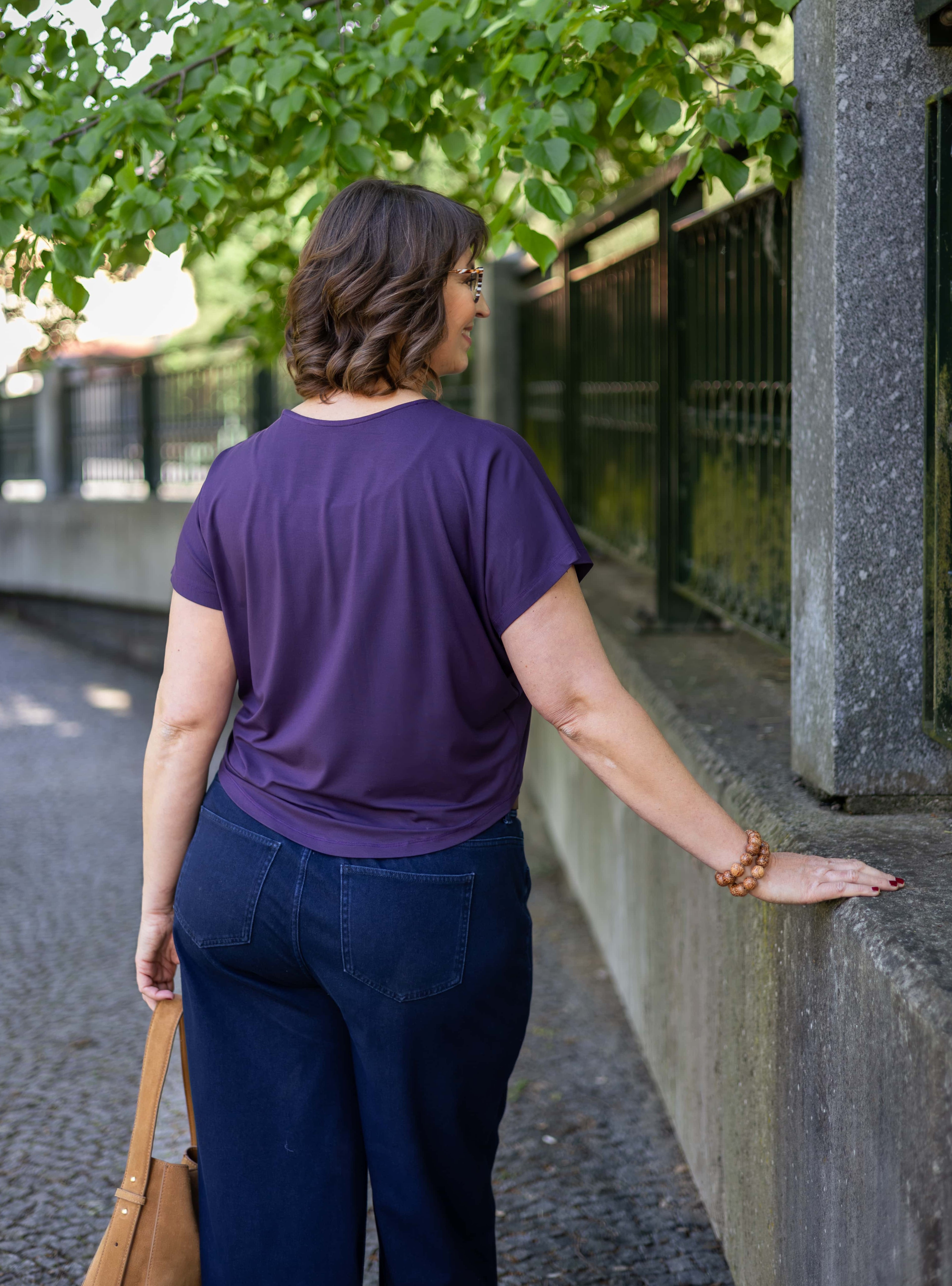 Kratší střih typu crop top s kulatým výstřihem a vzdušnými netopýřími rukávy se perfektně hodí na jaro, léto i teplý podzim.