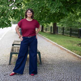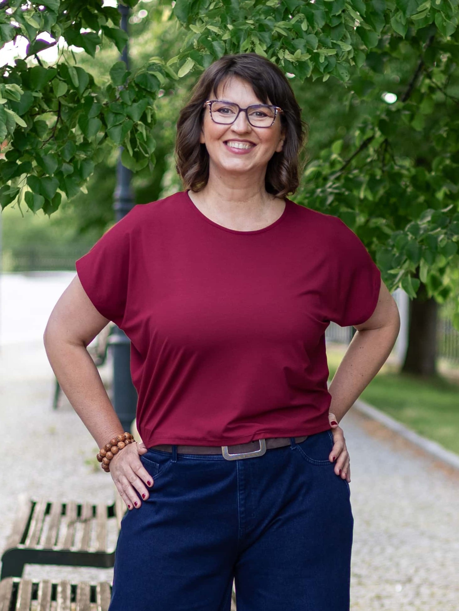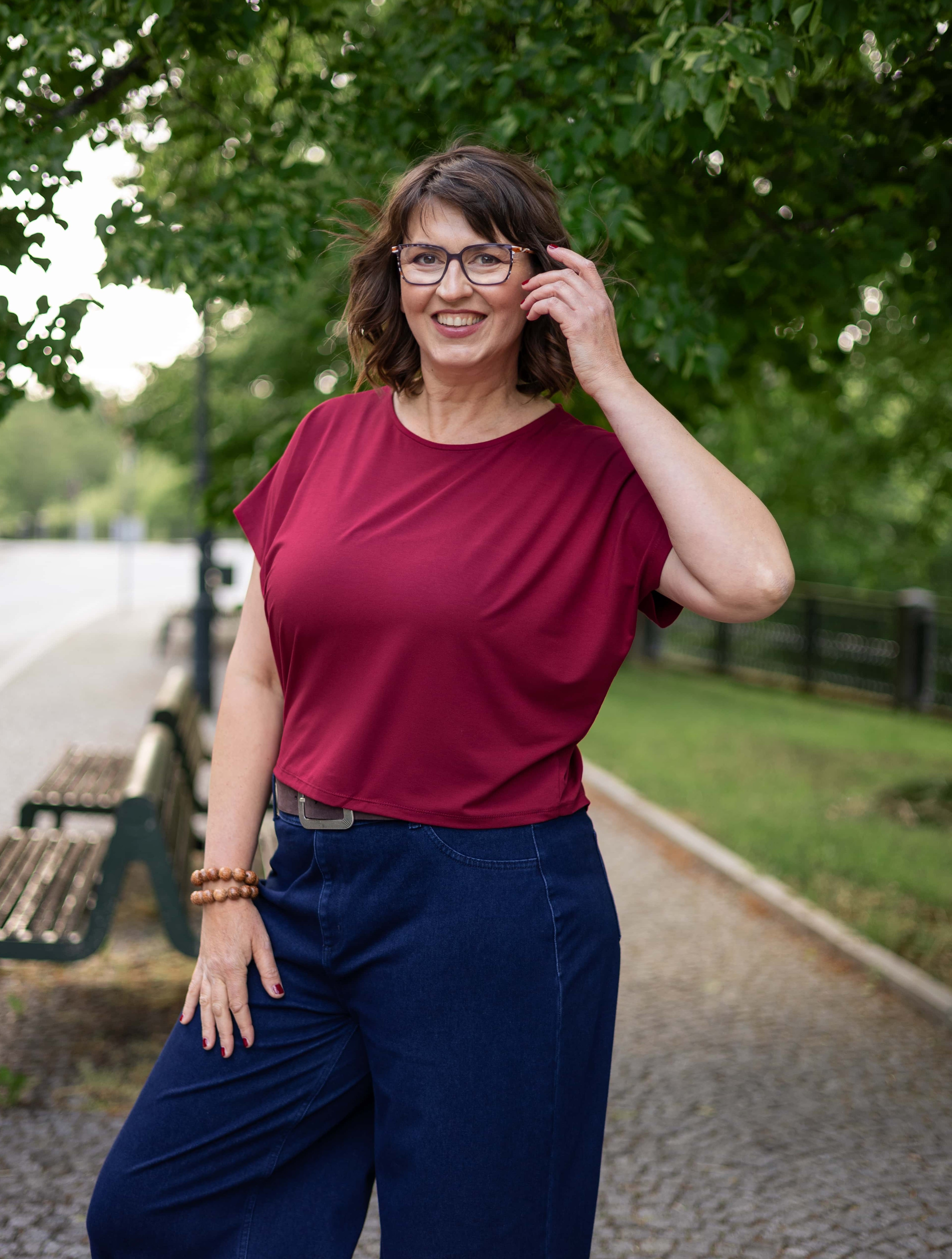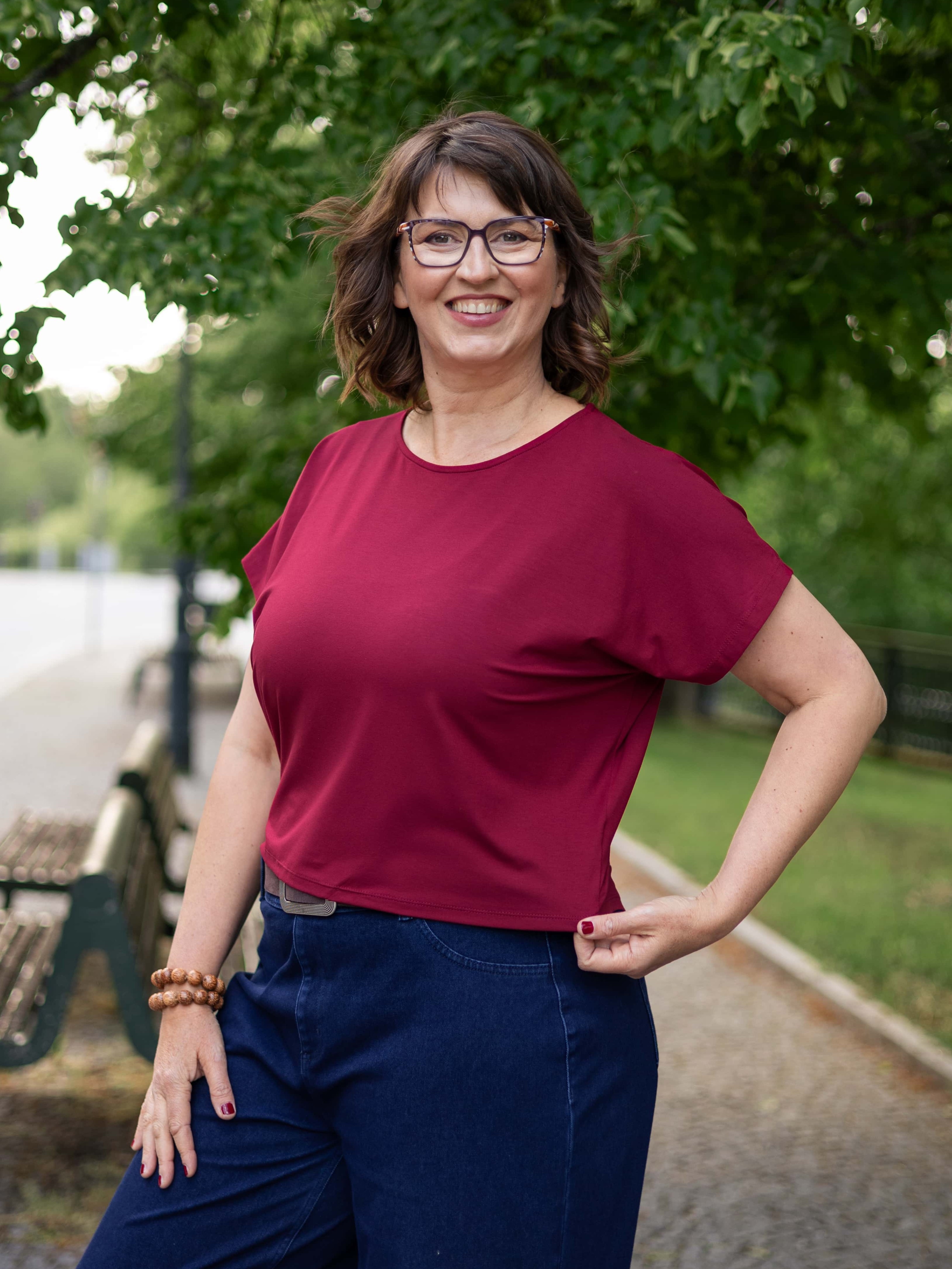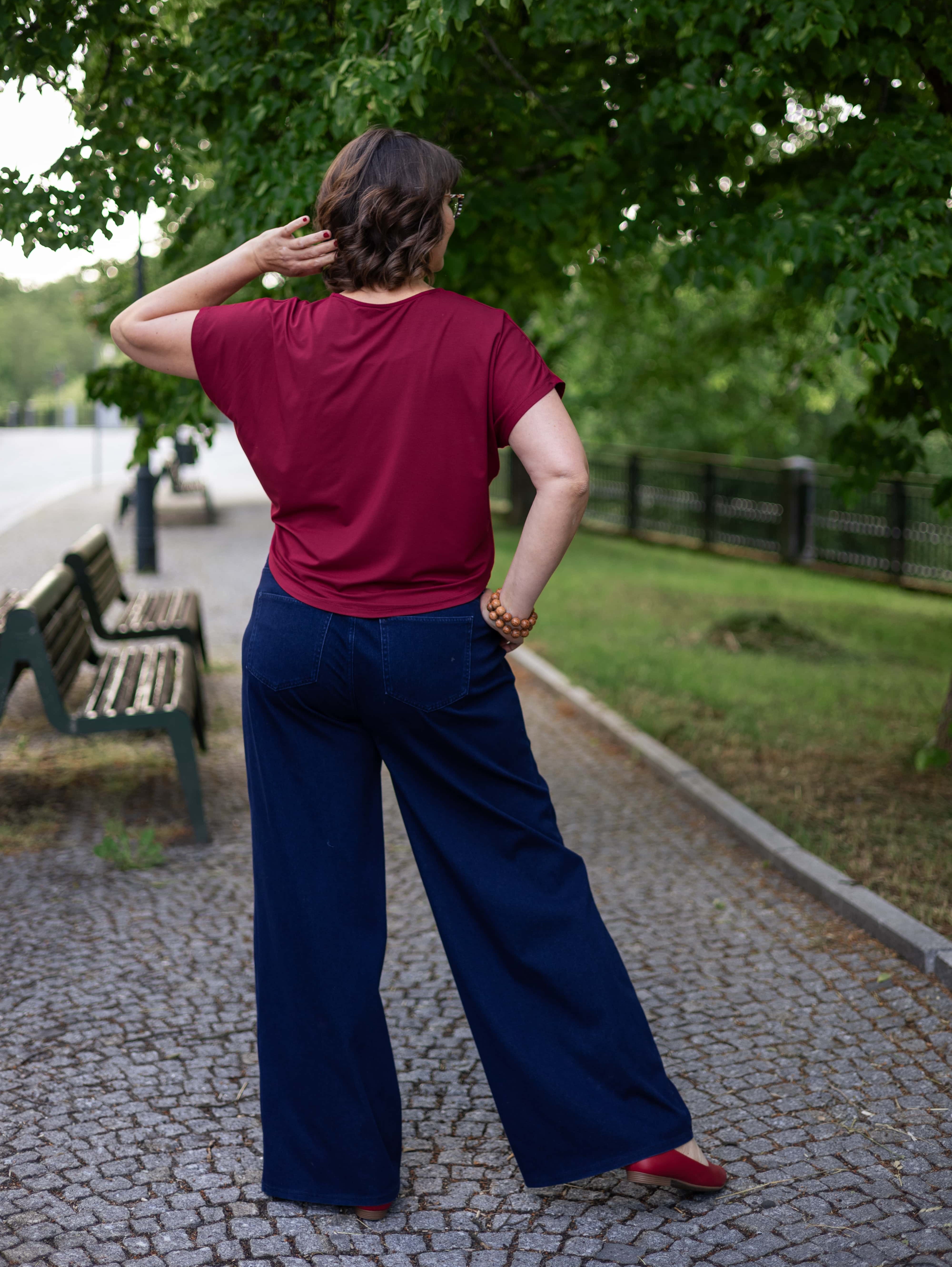 Kratší střih typu crop top s kulatým výstřihem a vzdušnými netopýřími rukávy se perfektně hodí na jaro, léto i teplý podzim.