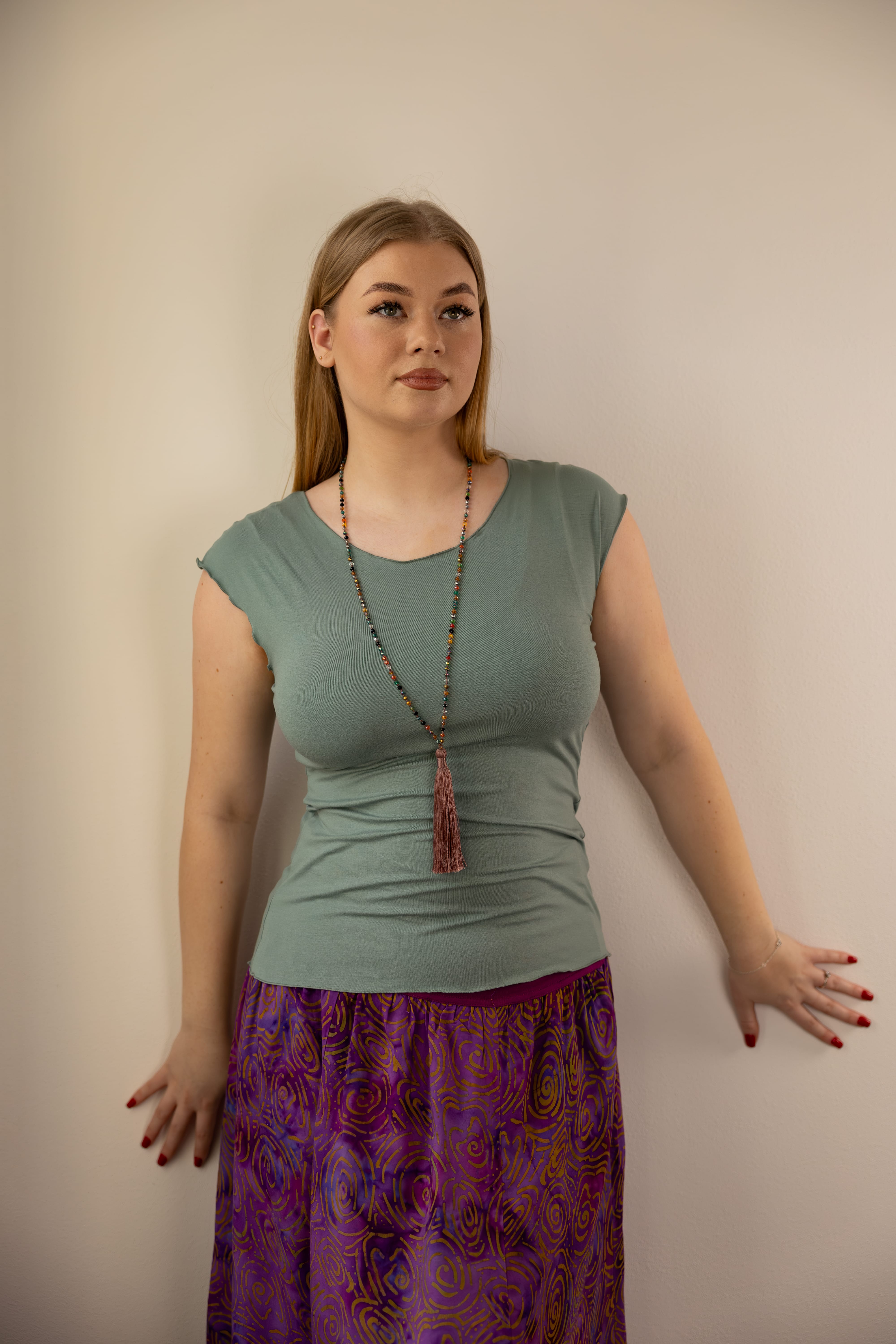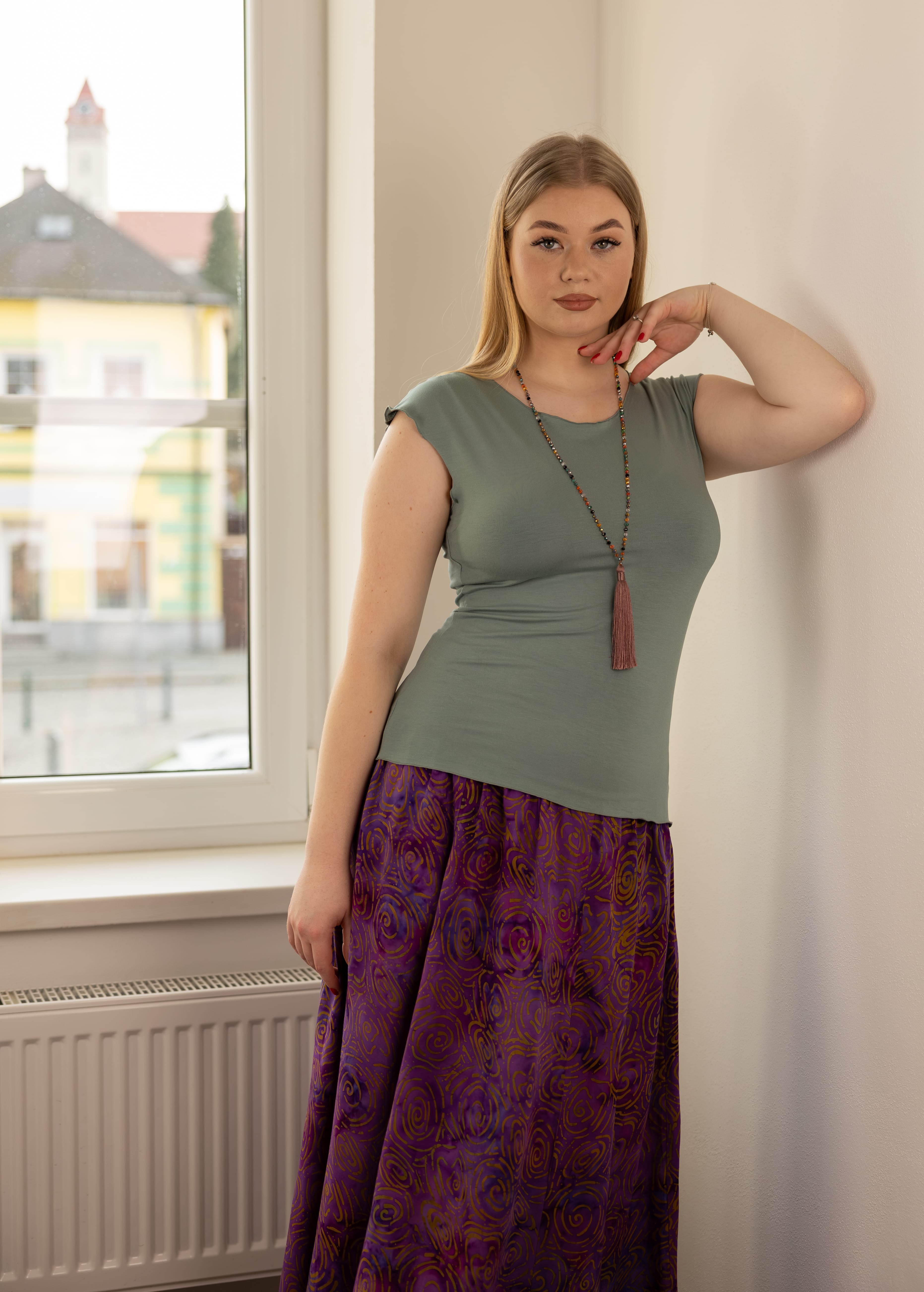 Triko Sunny je vyrobené z příjemné viskózy, stejně jako naše braletky, legíny, trika s ¾ rukávem a lemy u pohodlným dlouhých i krátkých sukní.