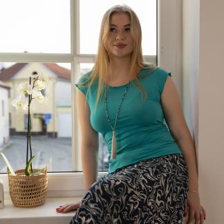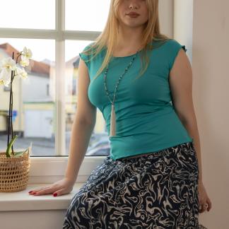 Pro správnou velikost trika Sunny použijte tuto velikostní tabulku. Obvod hrudníku, pasu a boků, stejně jako délka náramenice a trika, jsou uvedeny v cm. Triko je z pružného materiálu, a proto mají obvody rezervu + 10 cm.